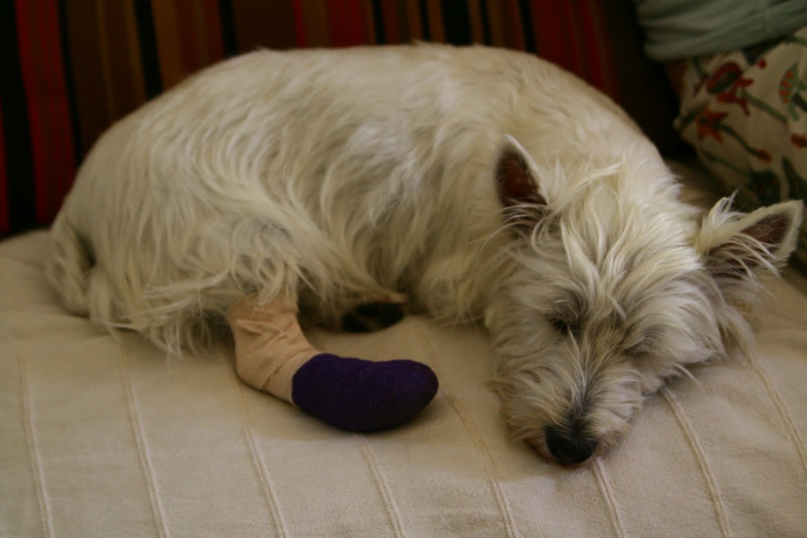 My Westie BB suffered a little mishap while doing her 'Rocket Dog' routine in the backyard a few days ago. She was zipping around the yard and must have caught her toe/foot in a crevice in some bricks because she quietly walked back inside and started licking her back paw. I saw a trail of blood leading all the way outside, and so we cleaned it and put some antibiotic cream on it, then got it properly looked at at the vet. The medicine makes her sleepy and low in energy, and we haven't walked her in two days. Hoping she gets better soon. Also I just want to note I how I love that the purple bandage makes her paw look like a little bean, heh.